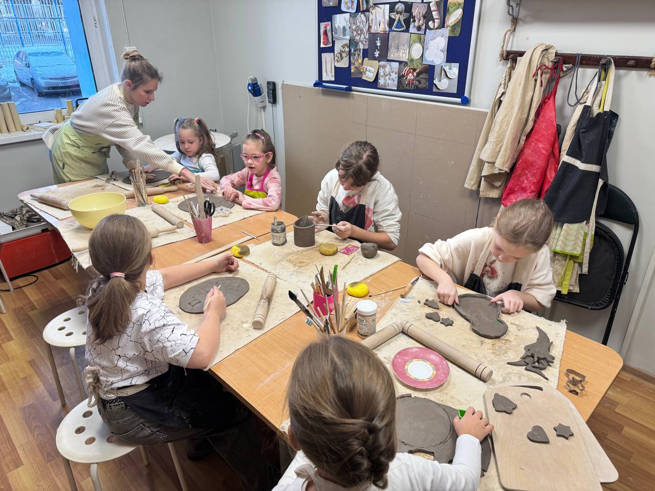 Мастер-класс "Керамика". Дети с увлечением раскатывали глину и вырезали из нее фигурки для будущих елочных игрушек. В качестве украшения мы создали рельефные узоры, раскрасили их и проделали отверстие для ленточки.