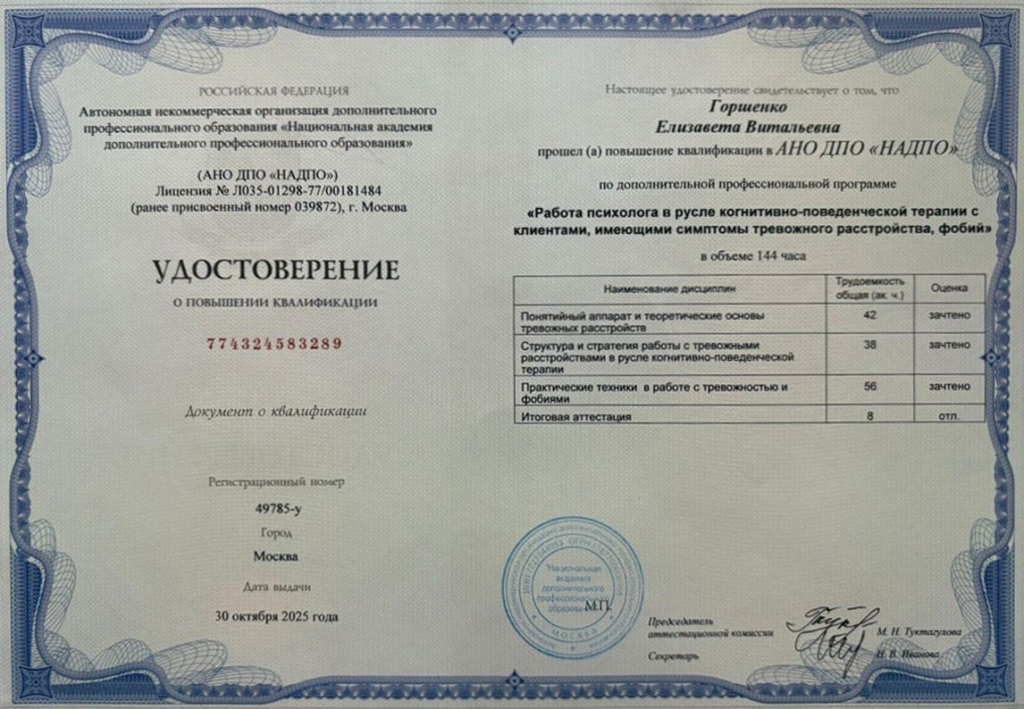 - Национальная академия профессионального образования курс «Песочная терапия», «Арт-терапия», «Профориентация. Специфика выбора профессии школьникам»